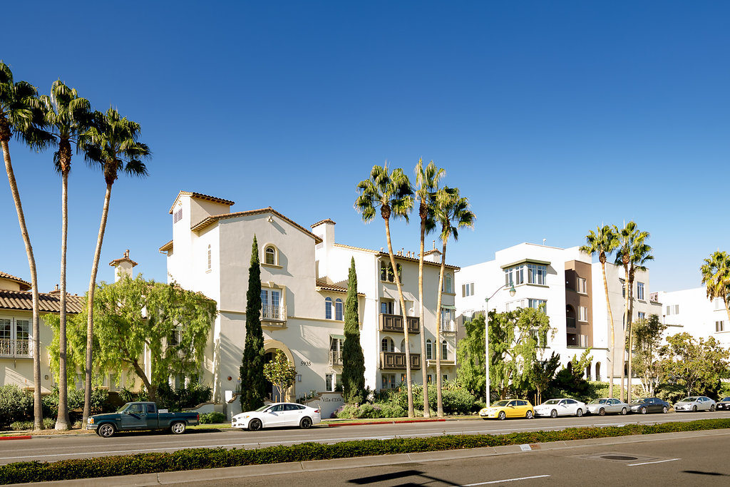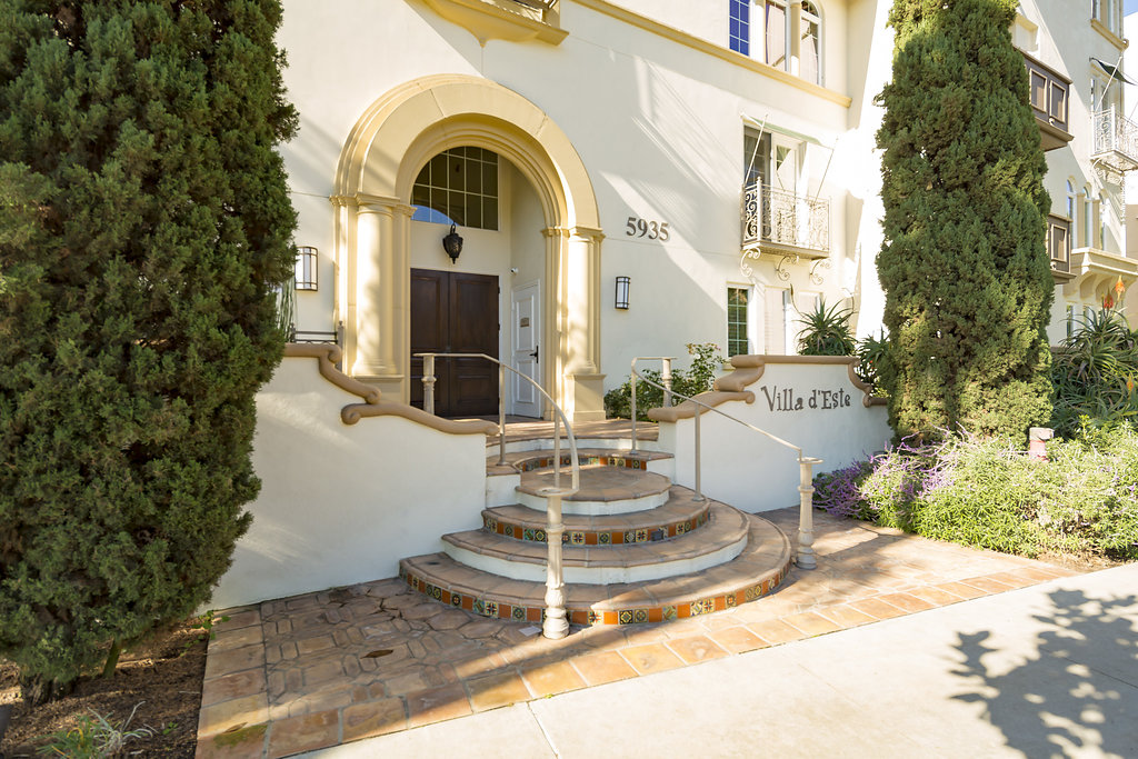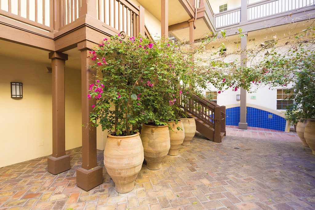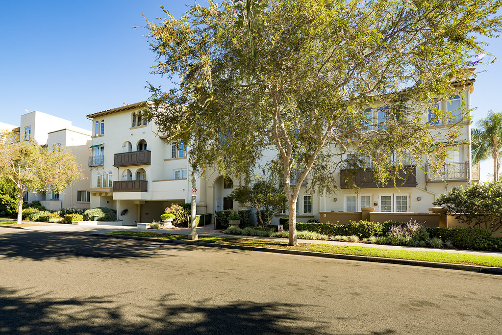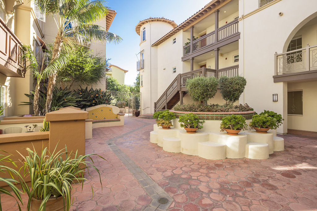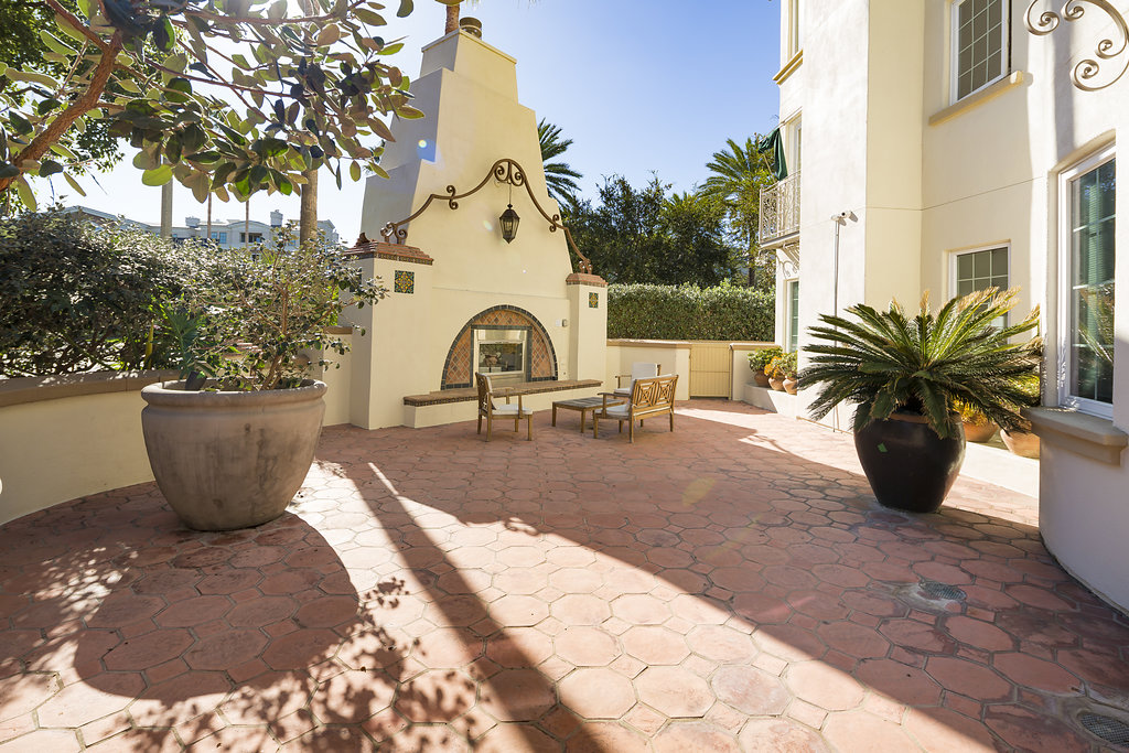 Rare floor plan in the elegant & intimate 39 unit Villa d’Este. Entry opens to large living room with fireplace and sunny, South-facing private patio overlooking the beautiful courtyard. Continue to kitchen featuring hardwood floors, white cabinets, granite countertops, breakfast nook, pantry, and another patio. Down the hall are an additional dining area and downstairs park-facing bedroom with third patio and full bathroom. Upstairs hallway features hardwood floors that lead to three more bedrooms (one is legally an office with built-in desk and shelving), two more full baths, and laundry room. Spacious master retreat has Juliet balcony and features en-suite bathroom with dual sinks and walk-in closet. Ample storage throughout and additional private storage unit in garage. Villa d’Este is located across the street from the Centerpointe Club and is a very short distance to numerous parks, Playa Vista Elementary School, Cinemark movie theater, and many exciting restaurants and shops.
